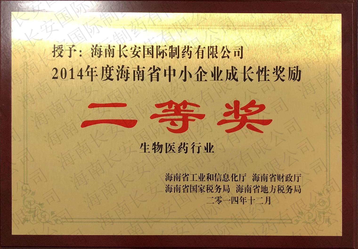 2014年度海南省中小企業(yè)成長性獎勵(生物醫(yī)藥行業(yè))-二等獎