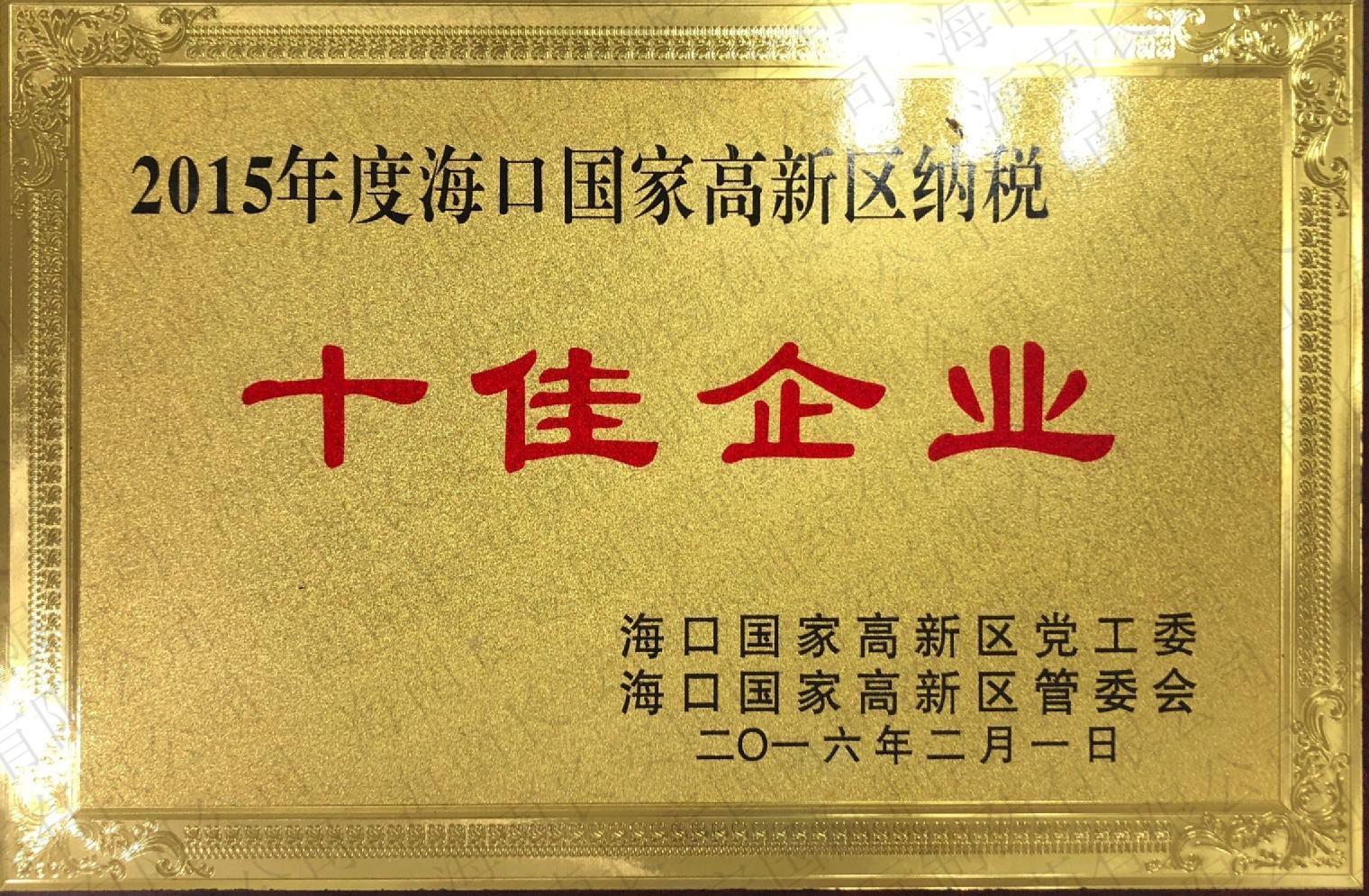 2015年度海口國家高新區(qū)納稅-十佳企業(yè)