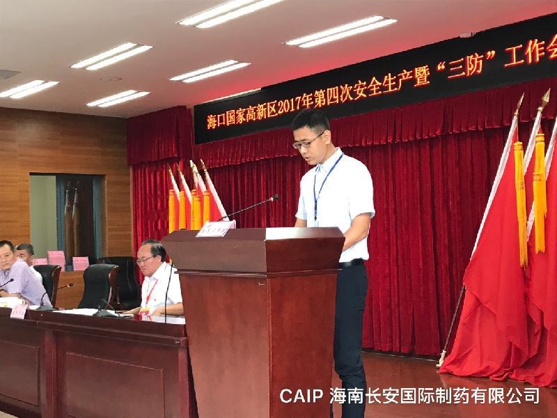 2017年10月20日,在??趪腋咝聟^(qū)2017年第四次安全生產(chǎn)暨“三防”工作會議上,海南長安國際制藥有限公司等11家企業(yè)在第20號臺風“卡努”期間,積極配合高新區(qū)管委會做好防風防汛及臨時避險點的安置工作,獲得“優(yōu)秀企業(yè)”表彰,公司有幸代表受表彰的企業(yè)之一受邀上臺發(fā)言。