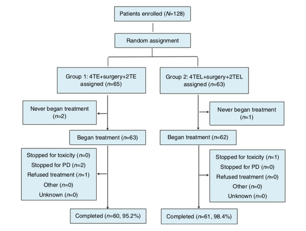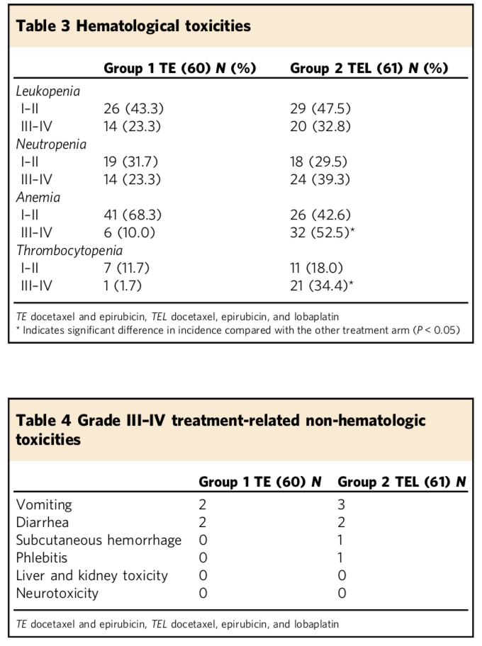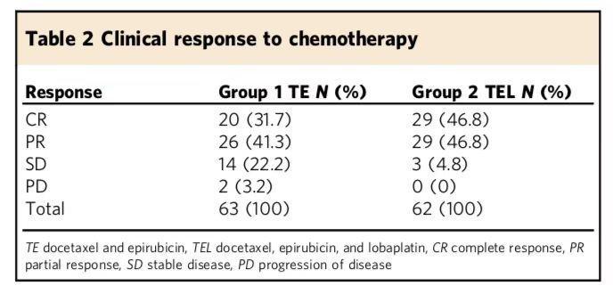 2、用藥方案:TE組63例,多西他賽 75mg/m2,表柔比星 80mg/m2, q21w,化療4個周期,手術(shù),再化療2個周期 TEL組62例,多西他賽 75mg/m2,表柔比星 80mg/m2,洛鉑30mg/m2, q21w,化療4個周期,手術(shù),再化療2個周期;
